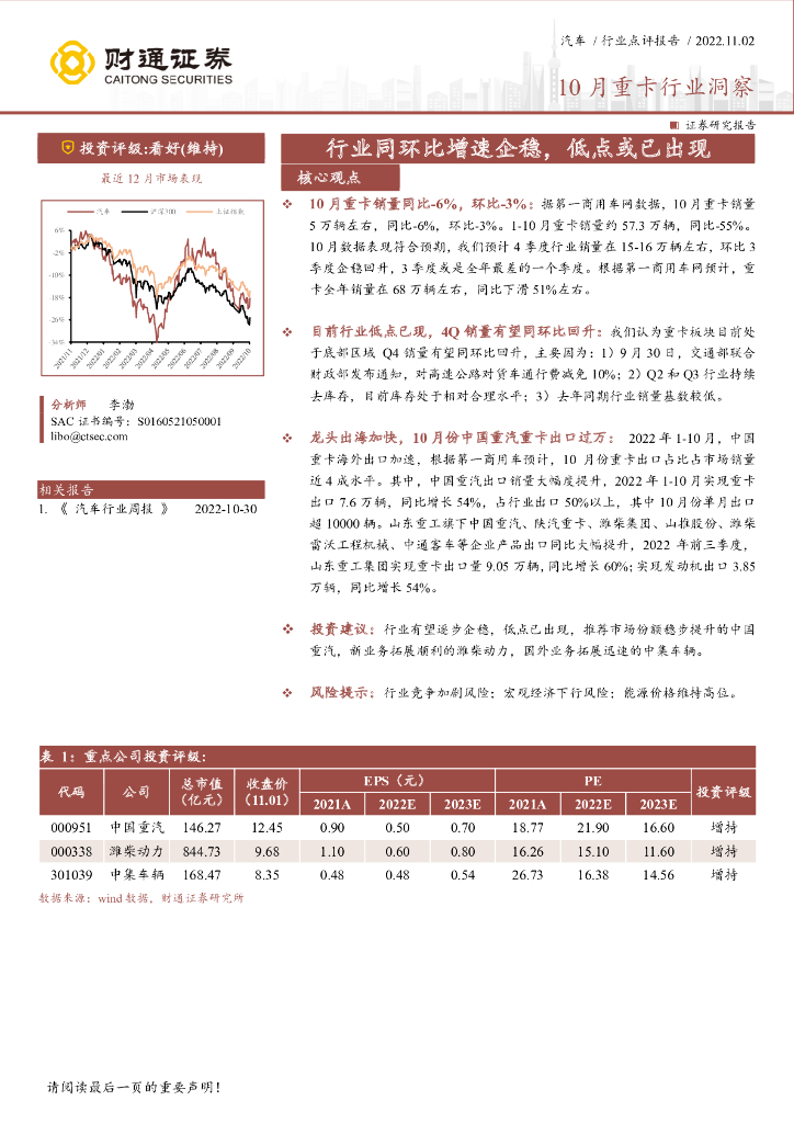 财通证券:10月重卡行业洞察:行业同环比增速企稳,低点或已出现.pdf