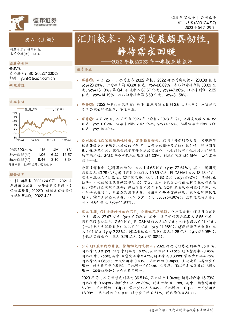 德邦证券:汇川技术(300124)-2022年报&2023年一季报业绩点评:公司发展颇具韧性,静待需求回暖.pdf
