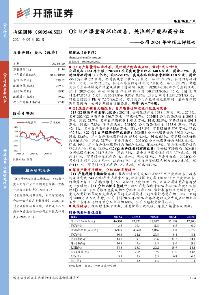 开源证券:山煤国际(600546)-公司2024年中报点评报告:Q2自产煤量价环比改善,关注新产能和高分红.pdf