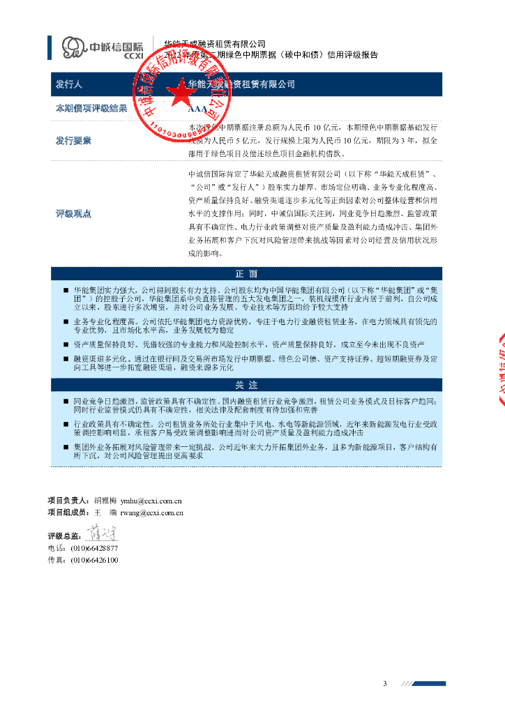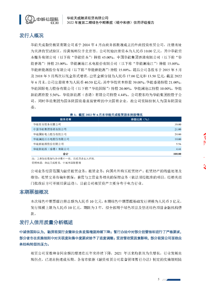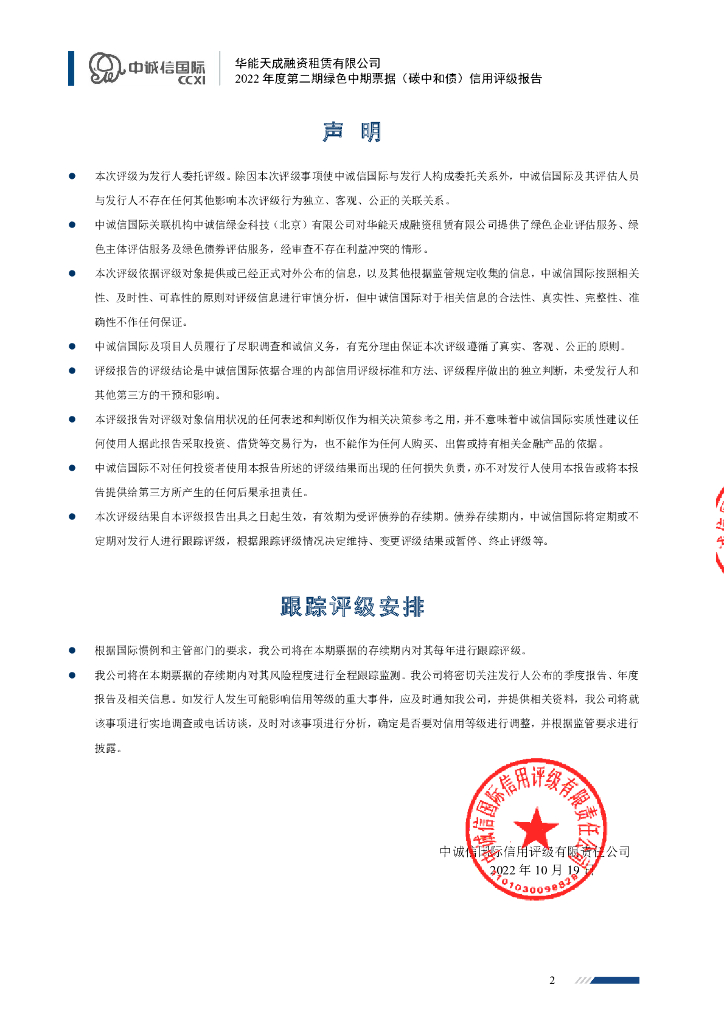 中诚信:华能天成融资租赁有限公司2022年度第二期绿色中期票据(碳中和债)信用评级报告.pdf