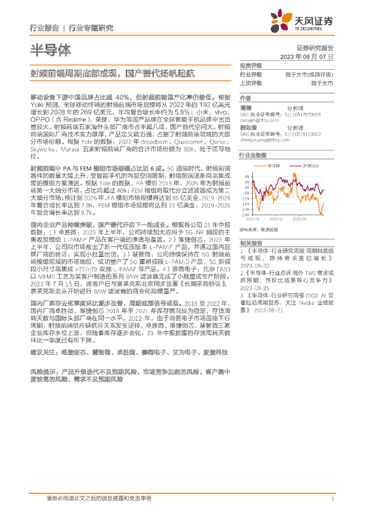 天风证券:半导体行业专题研究:射频前端周期底部或现,国产替代扬帆起航.pdf