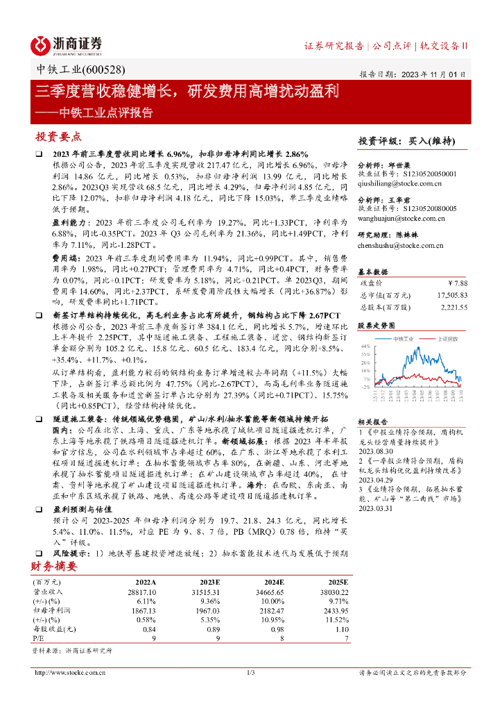 浙商证券:中铁工业点评报告:三季度营收稳健增长,研发费用高增扰动盈利.pdf