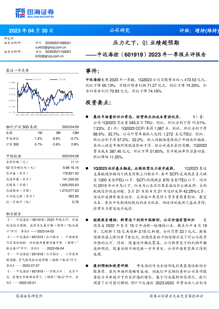 国海证券:中远海控(601919)-2023年一季报点评报告:压力之下,Q1业绩超预期.pdf