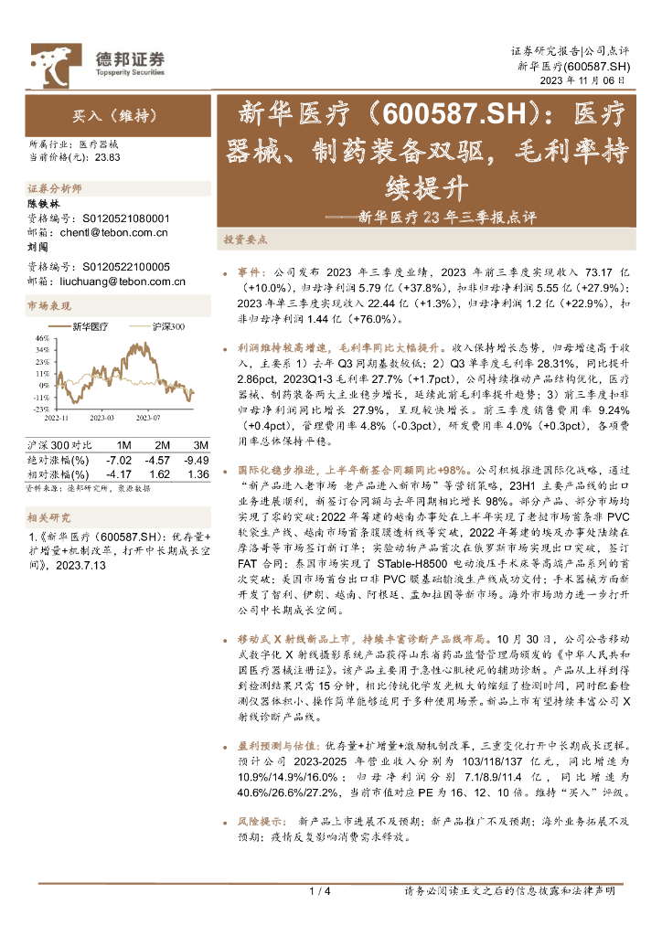 德邦证券:新华医疗(600587)-23年三季报点评:医疗器械、制药装备双驱,毛利率持续提升.pdf