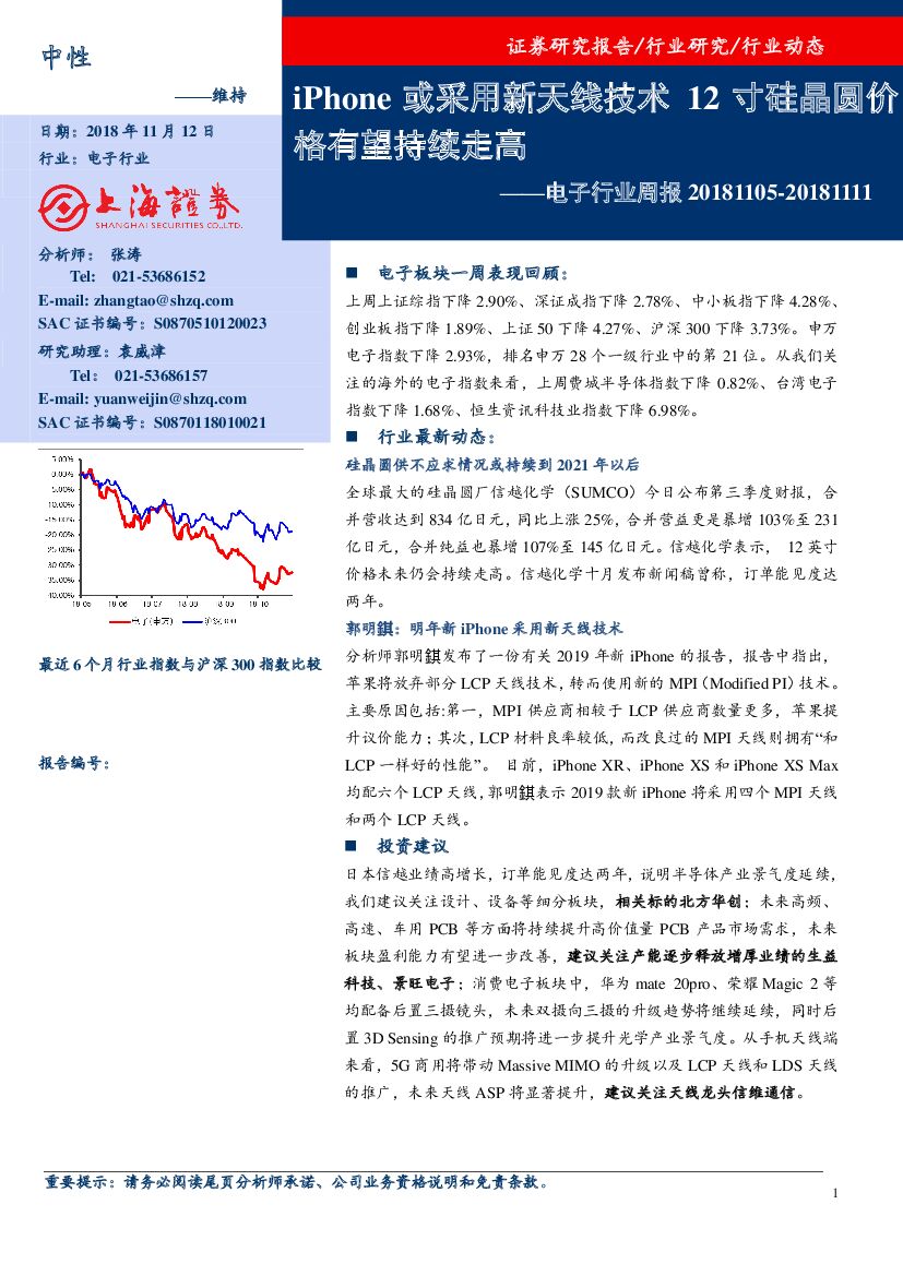上海证券:电子行业周报:iPhone或采用新天线技术 12寸硅晶圆价格有望持续走高.pdf