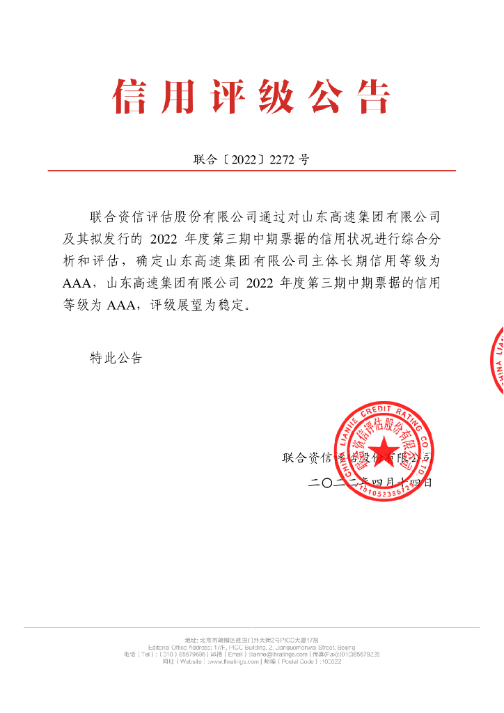 联合资信:山东高速集团有限公司2022年度第三期中期票据信用评级报告及跟踪评级安排.pdf
