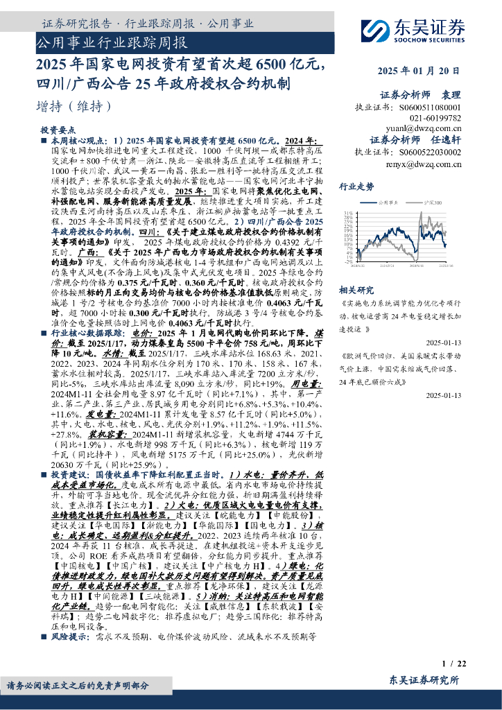 东吴证券:公用事业行业跟踪周报:2025年国家电网投资有望首次超6500亿元,四川/广西公告25年政府授权合约机制.pdf