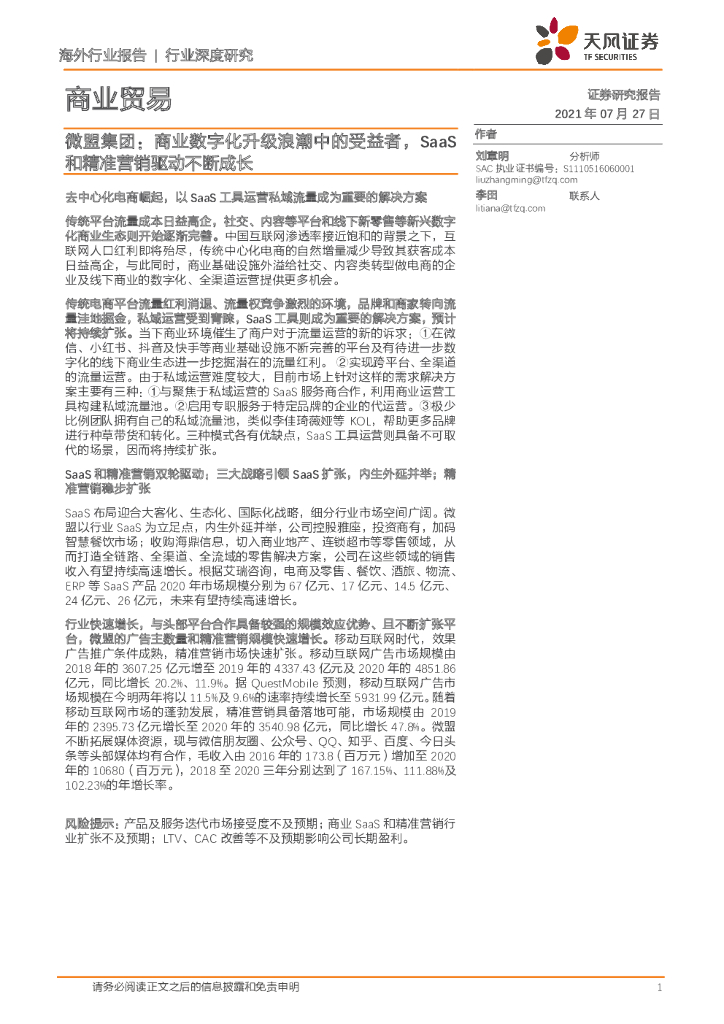 天风证券:商业贸易行业深度研究:微盟集团:商业数字化升级浪潮中的受益者,SaaS和精准营销驱动不断成长.pdf