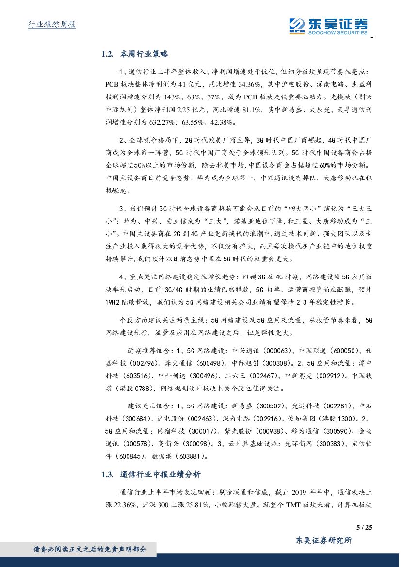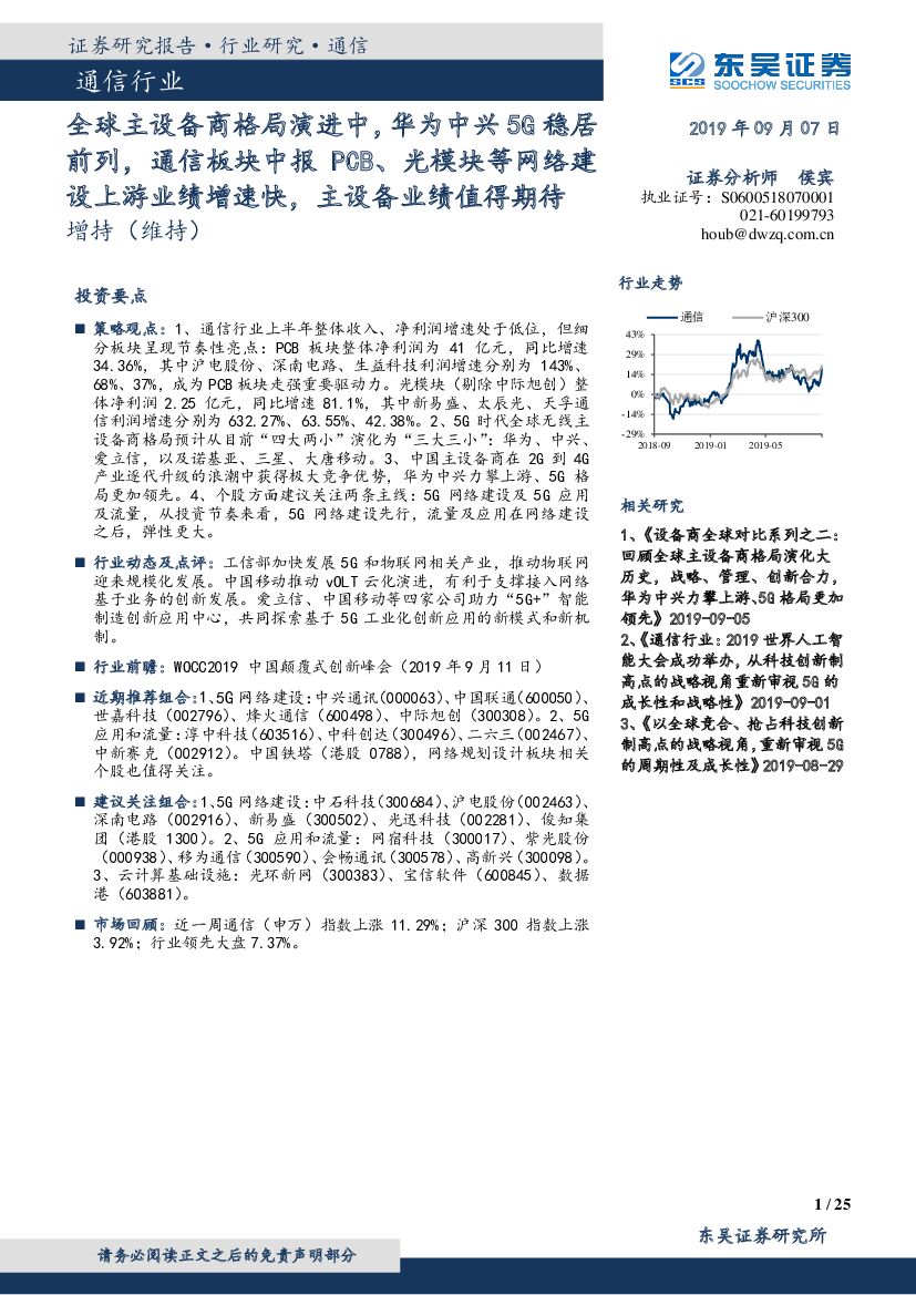 东吴证券:通信行业:全球主设备商格局演进中,华为中兴5G稳居前列,通信板块中报PCB、光模块等网络建设上游业绩增速快,主设备业绩值得期待.pdf