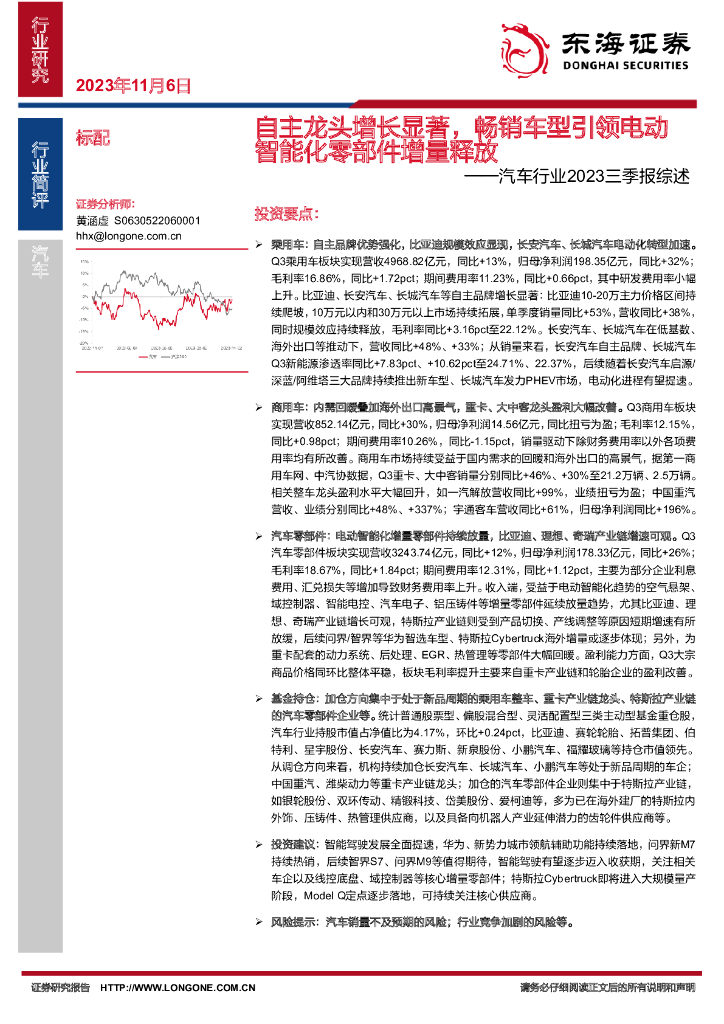 东海证券:汽车行业2023三季报综述:自主龙头增长显著,畅销车型引领电动智能化零部件增量释放.pdf