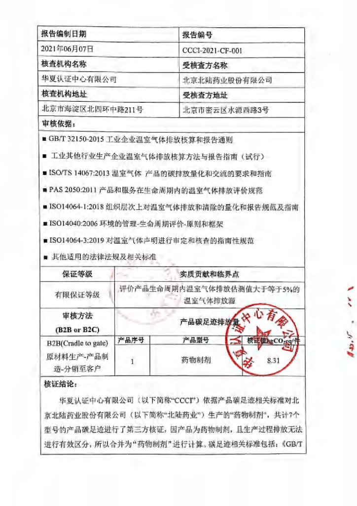 北陆药业:2020年产品碳足迹核查报告书.pdf