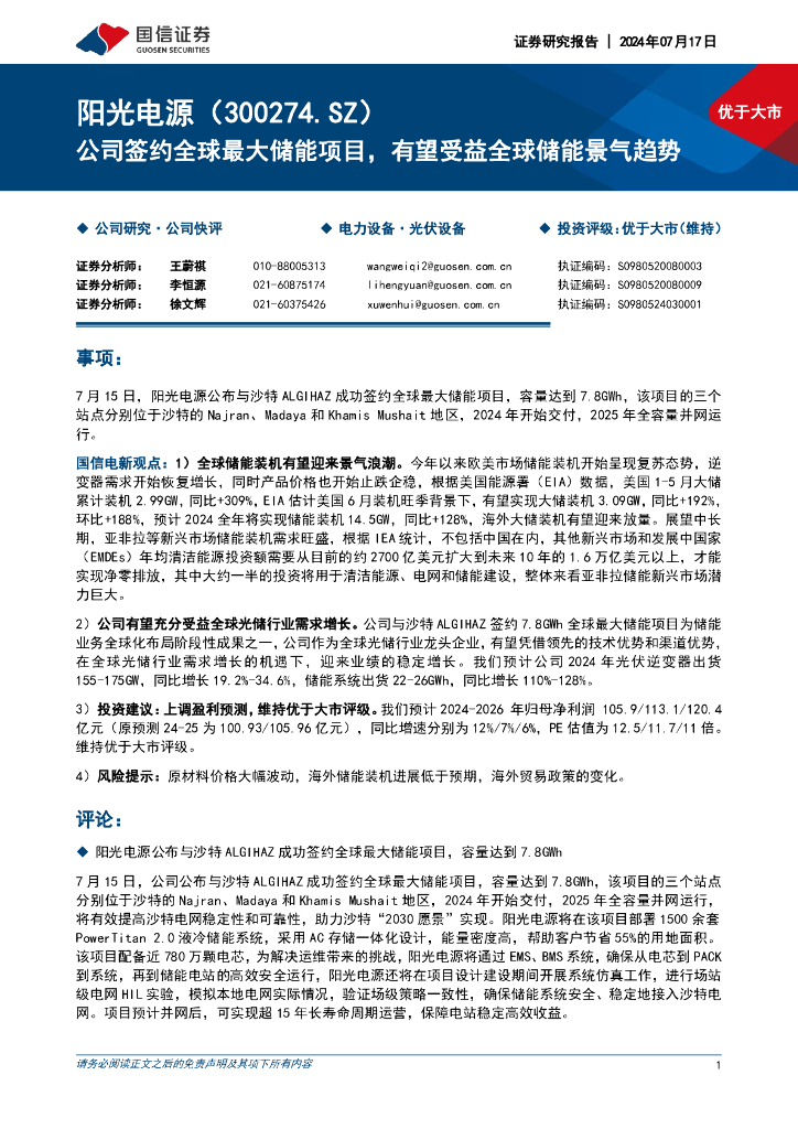 国信证券:阳光电源(300274)-公司签约全球最大储能项目,有望受益全球储能景气趋势.pdf