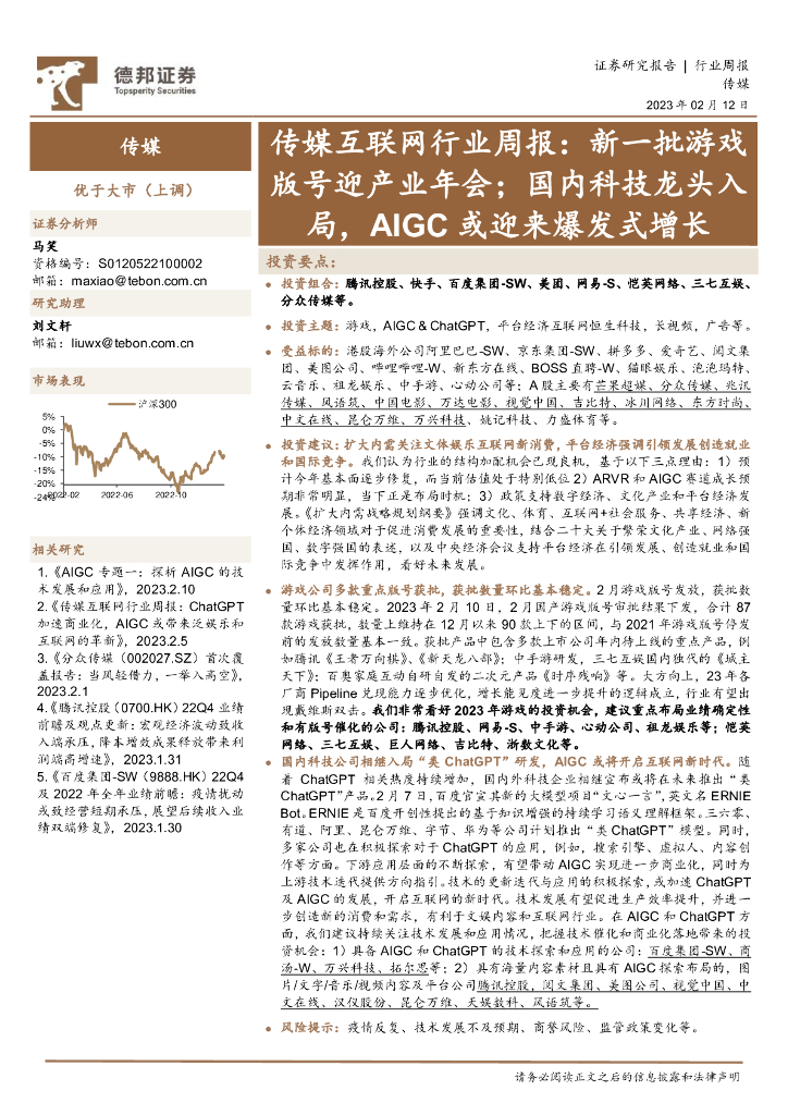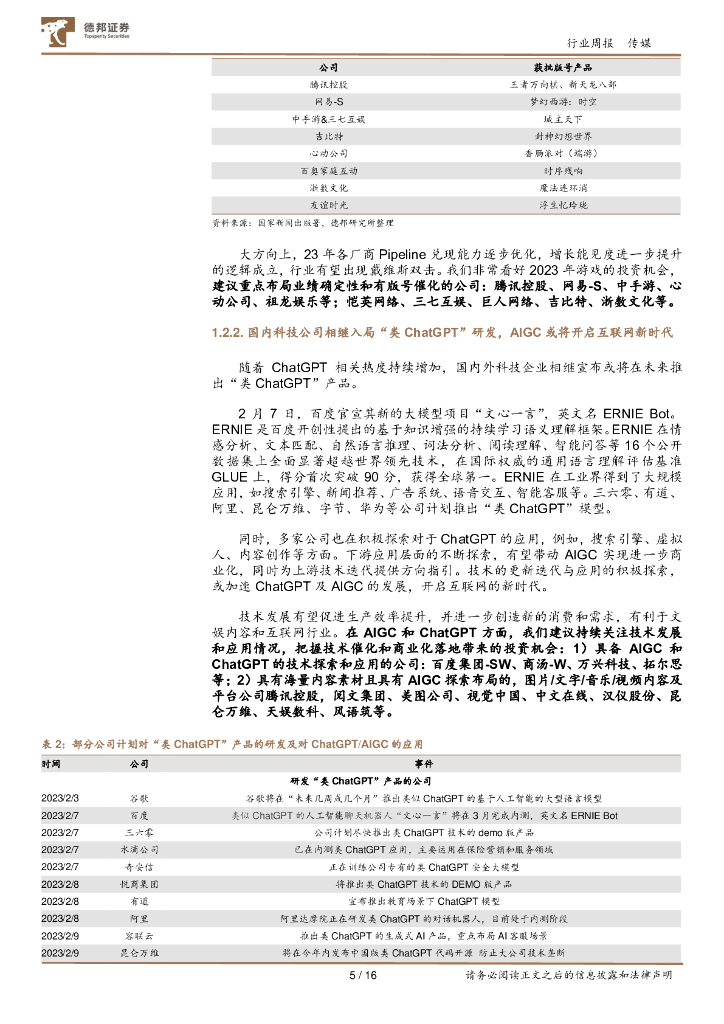德邦证券:传媒互联网行业周报:新一批游戏版号迎产业年会;国内科技龙头入局,AIGC或迎来爆发式增长.pdf