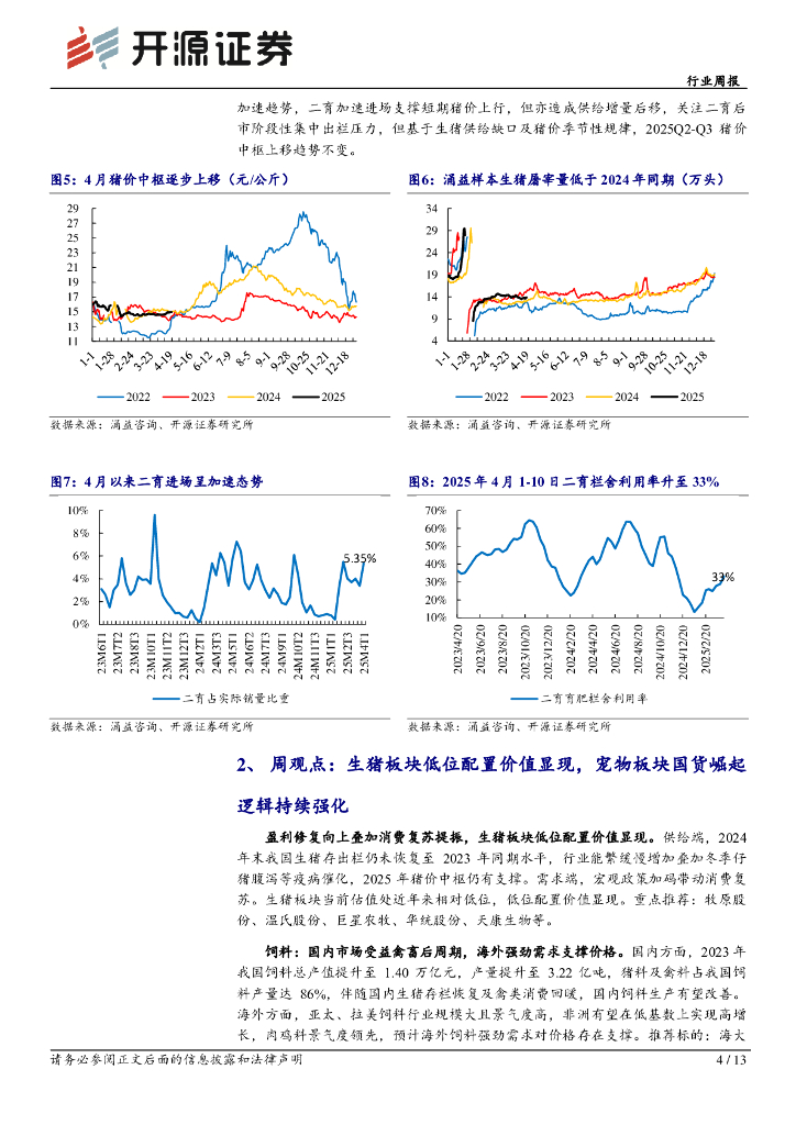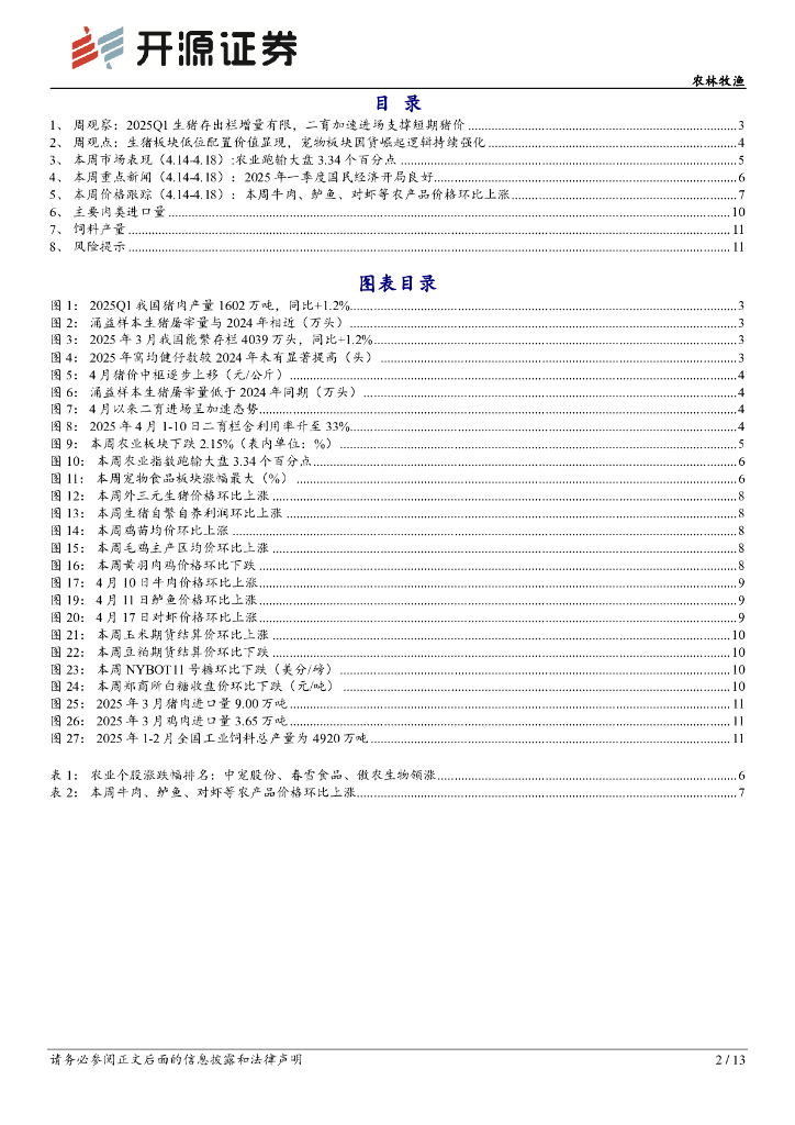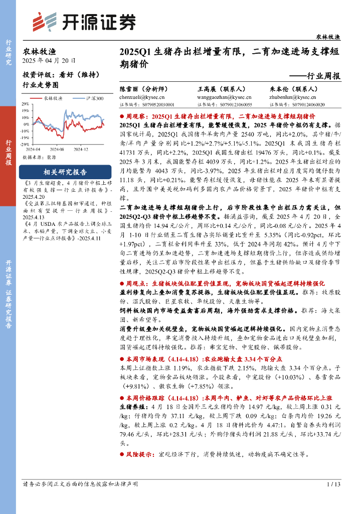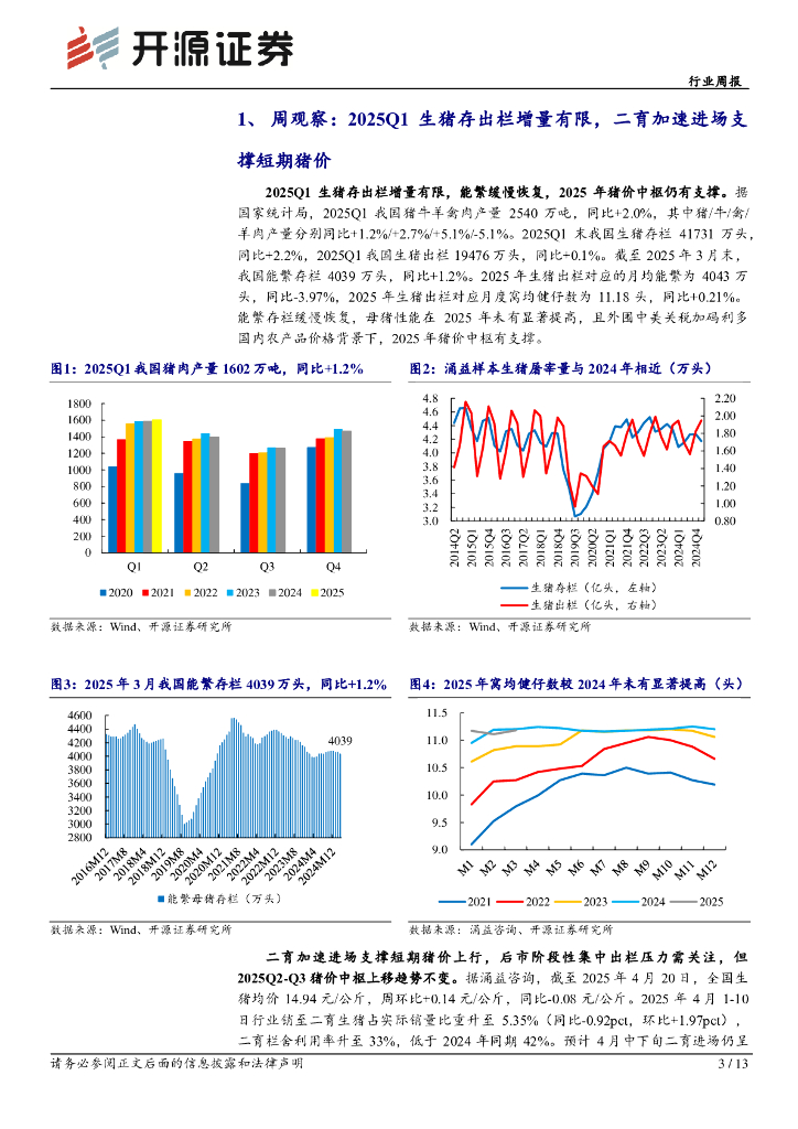 开源证券:农林牧渔行业周报:2025Q1生猪存出栏增量有限,二育加速进场支撑短期猪价.pdf
