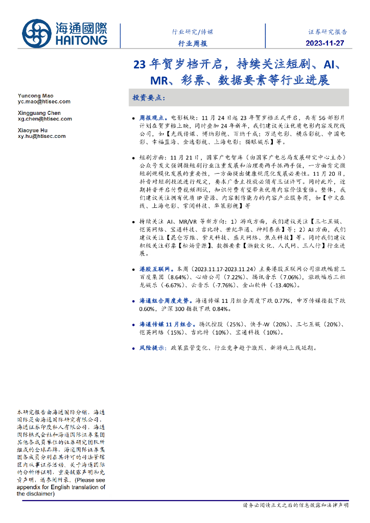 海通国际:传媒行业周报:23年贺岁档开启,持续关注短剧、AI、MR、彩票、数据要素等行业进展.pdf