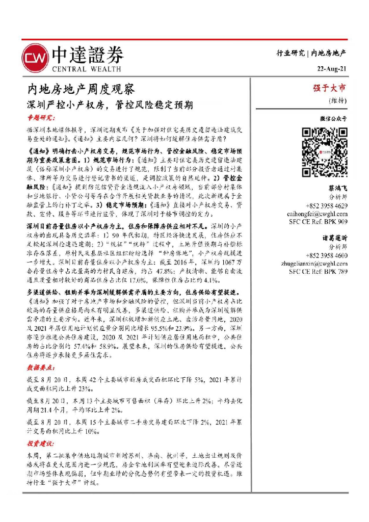 中达证券投资:内地房地产周度观察:深圳严控小产权房,管控风险稳定预期.pdf