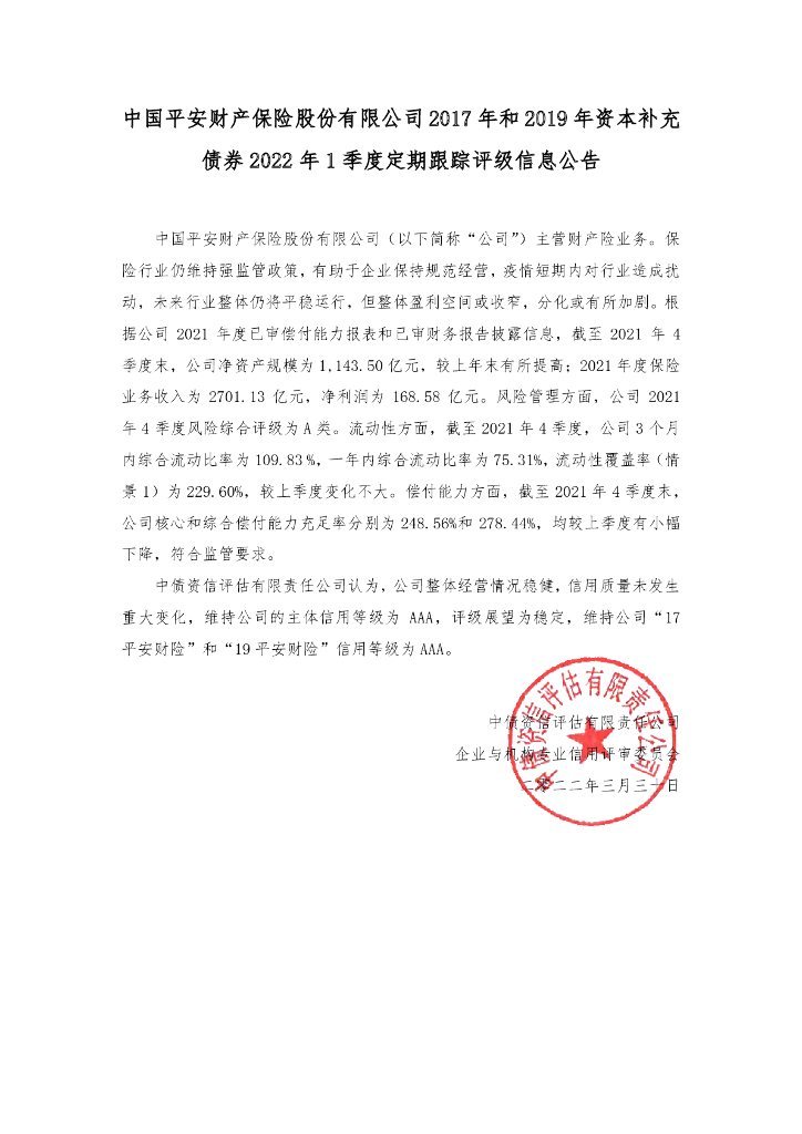 中债资信:中国平安财产保险股份有限公司2017年和2019年资本补充债券2022年1季度定期跟踪评级信息公告.pdf