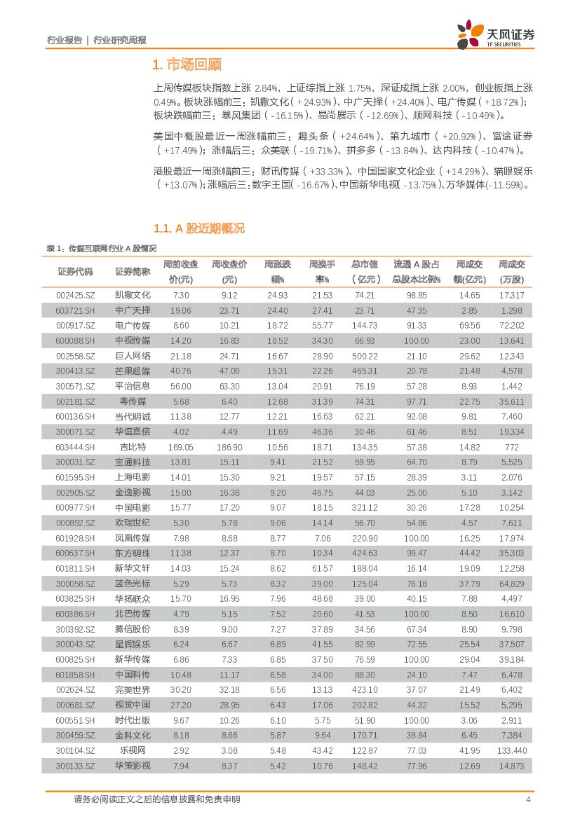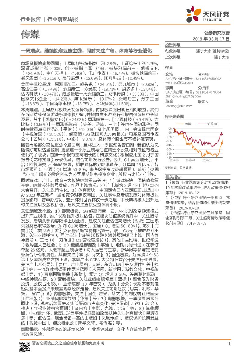 天风证券:传媒行业一周观点:继续锁定业绩主线,同时关注广电、体育等行业催化.pdf
