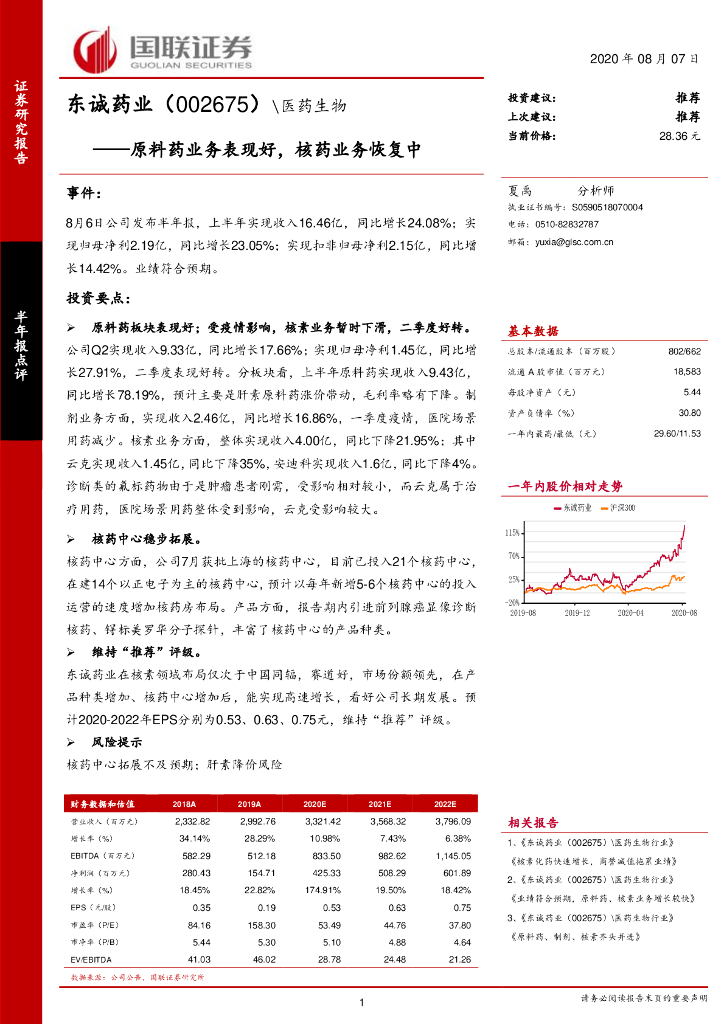 国联证券:东诚药业(002675)-原料药业务表现好,核药业务恢复中.pdf