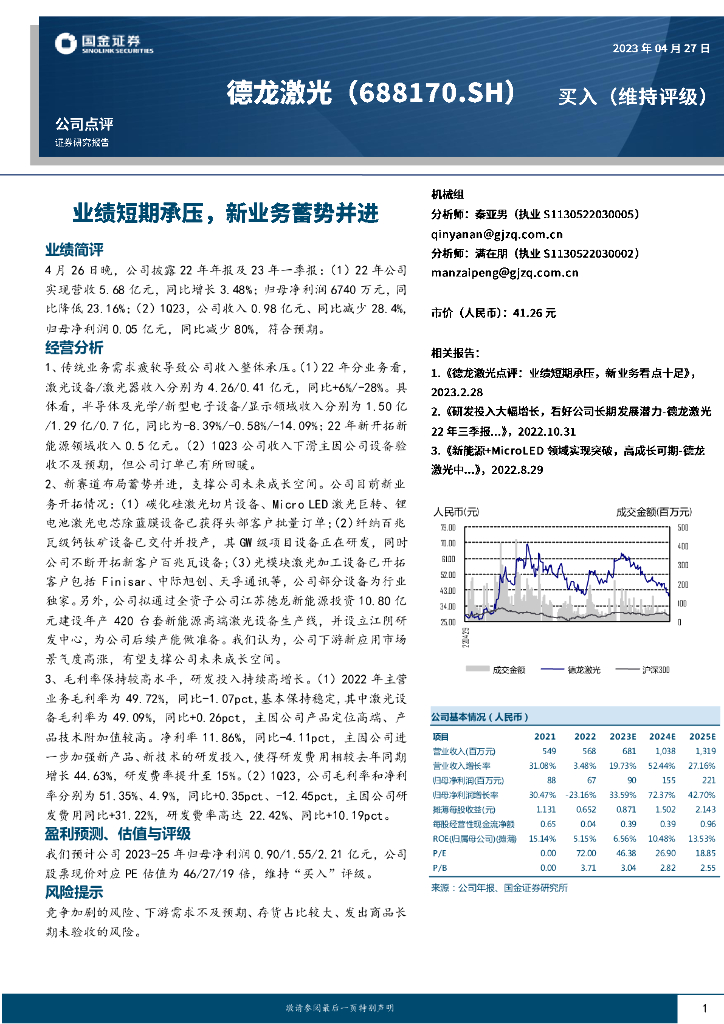 国金证券:德龙激光(688170)-业绩短期承压,新业务蓄势并进.pdf
