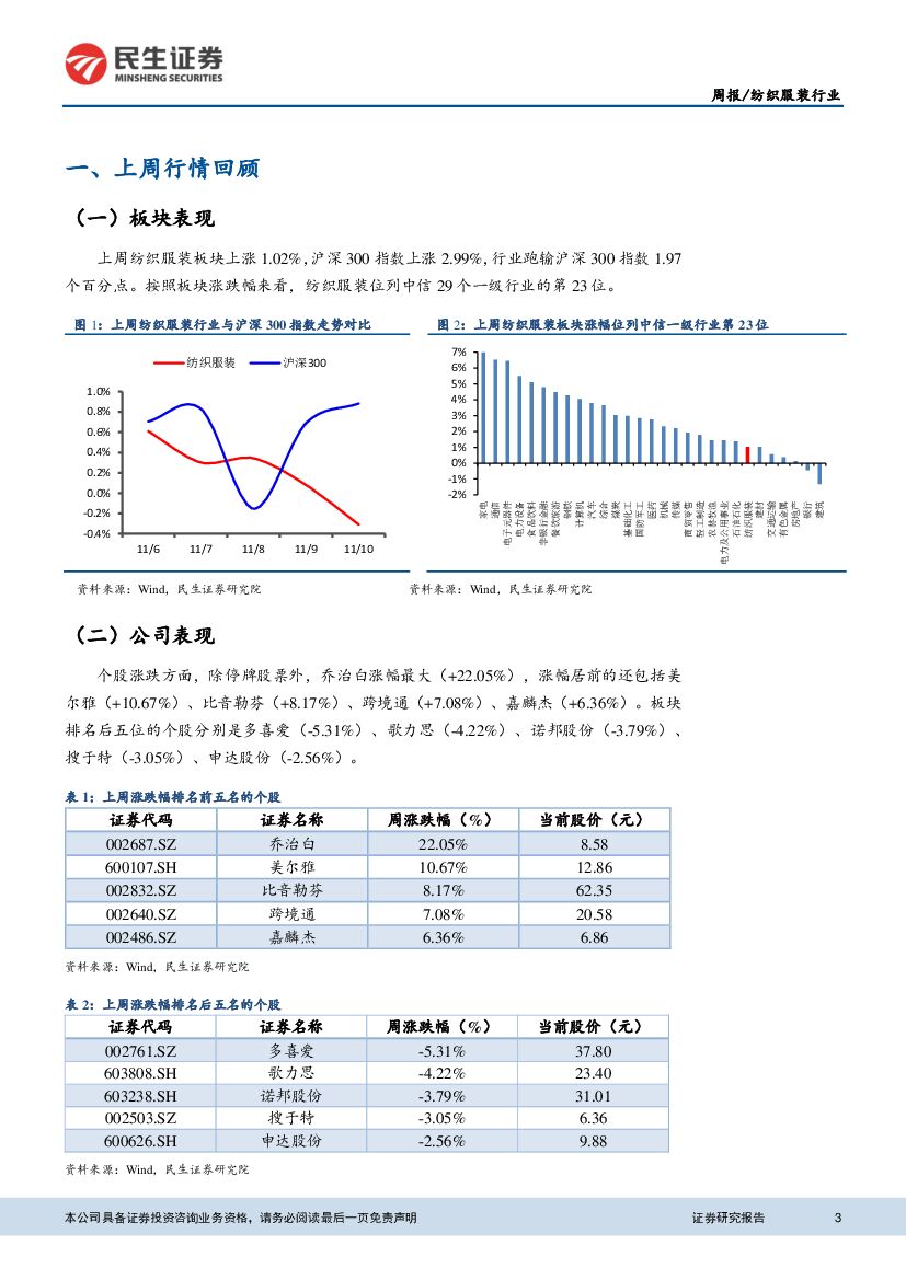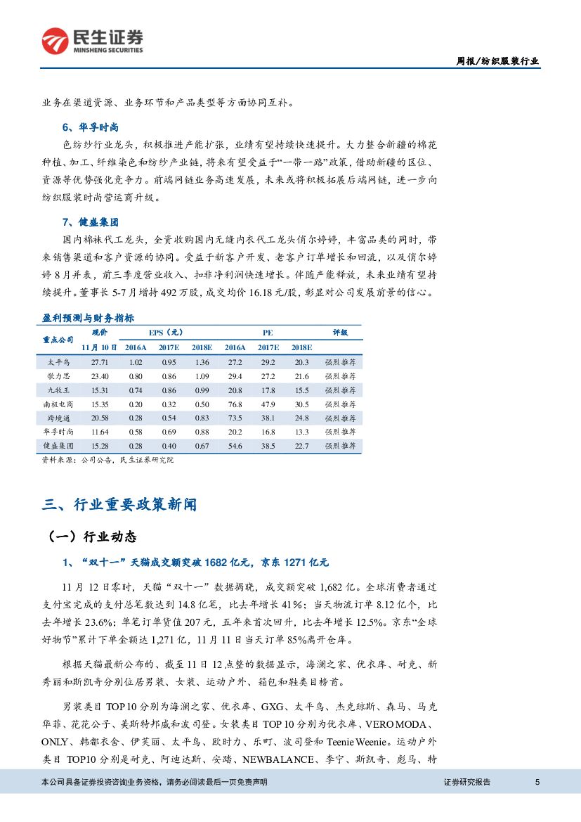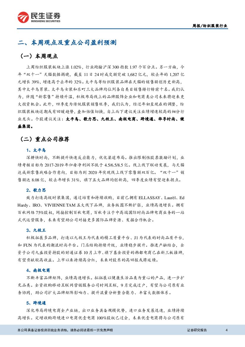 民生证券:纺织服装行业周报:“双十一”数据揭晓,太平鸟等品牌销售创新高.pdf