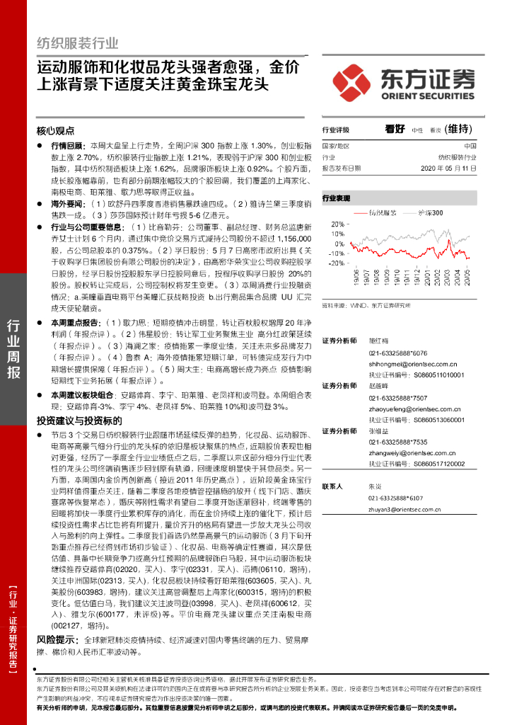 东方证券:纺织服装行业周报:运动服饰和化妆品龙头强者愈强,金价上涨背景下适度关注黄金珠宝龙头.pdf