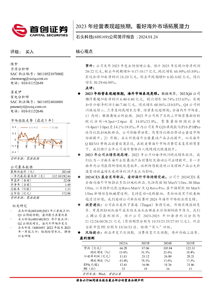 首创证券:石头科技(688169)-公司简评报告:2023年经营表现超预期,看好海外市场拓展潜力.pdf