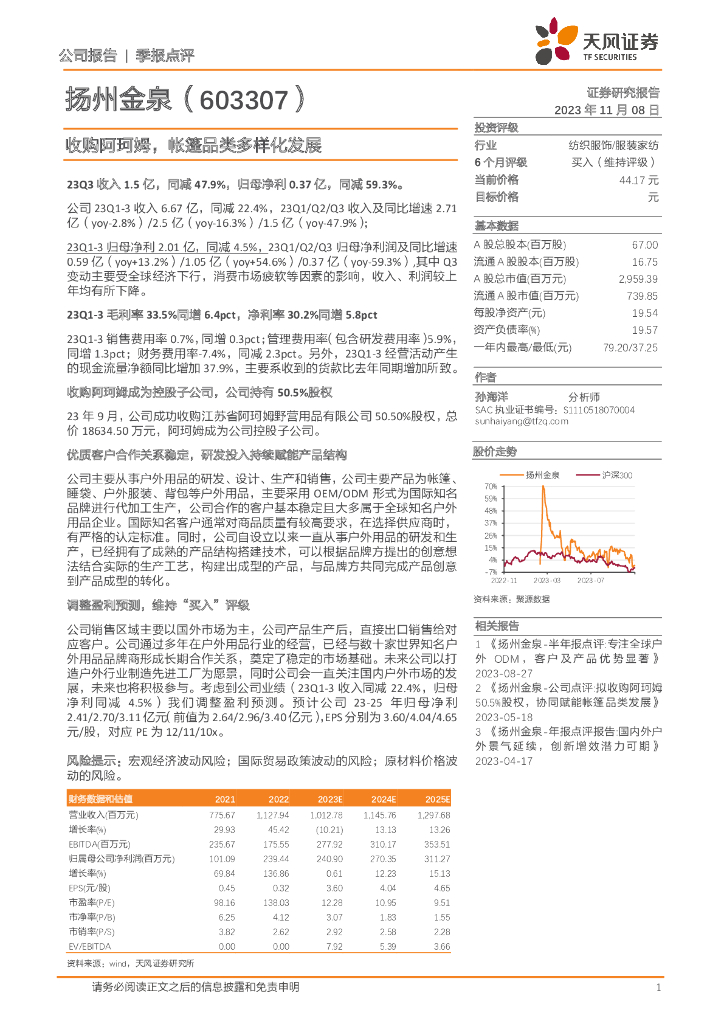 天风证券:扬州金泉(603307)-收购阿珂姆,帐篷品类多样化发展.pdf