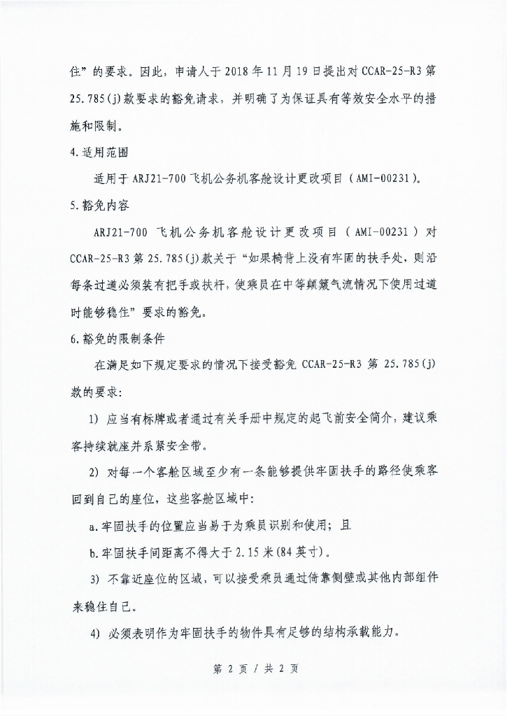 ARJ21-700飞机公务机客舱设计更改项目对CCAR-25-R3第25.785(j)款要求的豁免.pdf