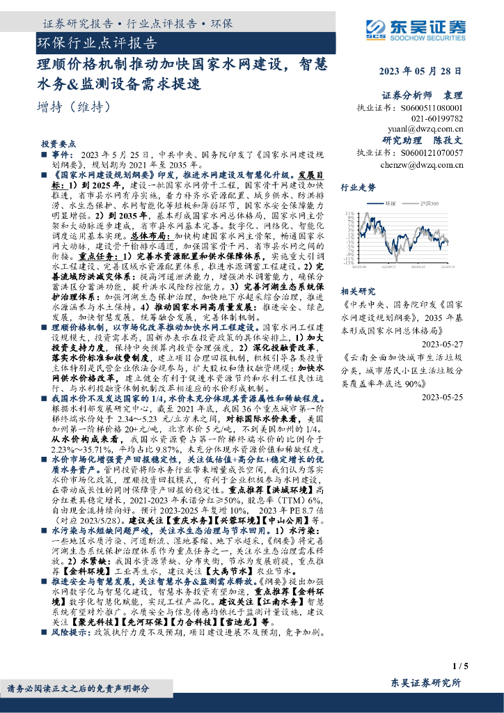 东吴证券:环保行业点评报告:理顺价格机制推动加快国家水网建设,智慧水务&监测设备需求提速.pdf