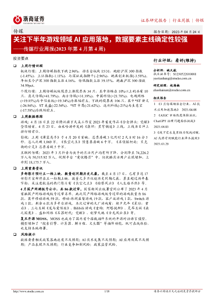 浙商证券:传媒行业周报(2023年第4月第4周):关注下半年游戏领域AI应用落地,数据要素主线确定性较强.pdf