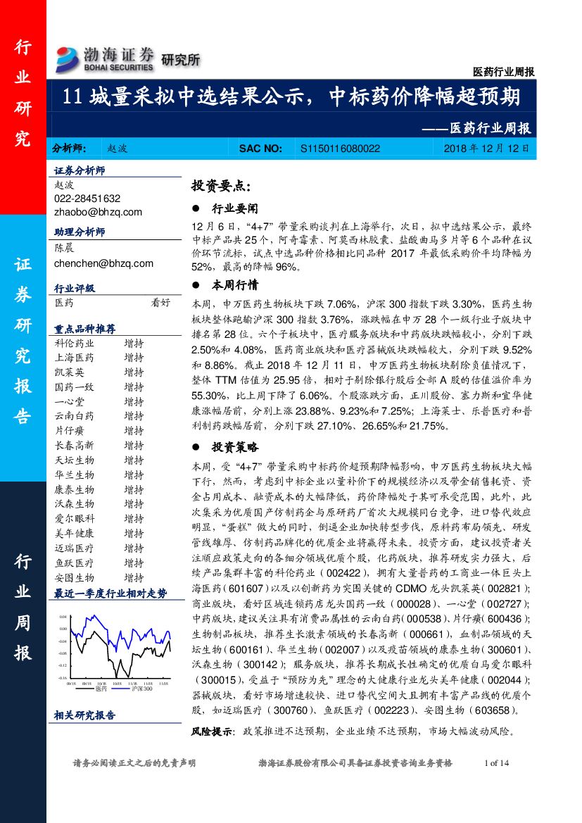 渤海证券:医药行业周报:11城量采拟中选结果公示,中标药价降幅超预期.pdf