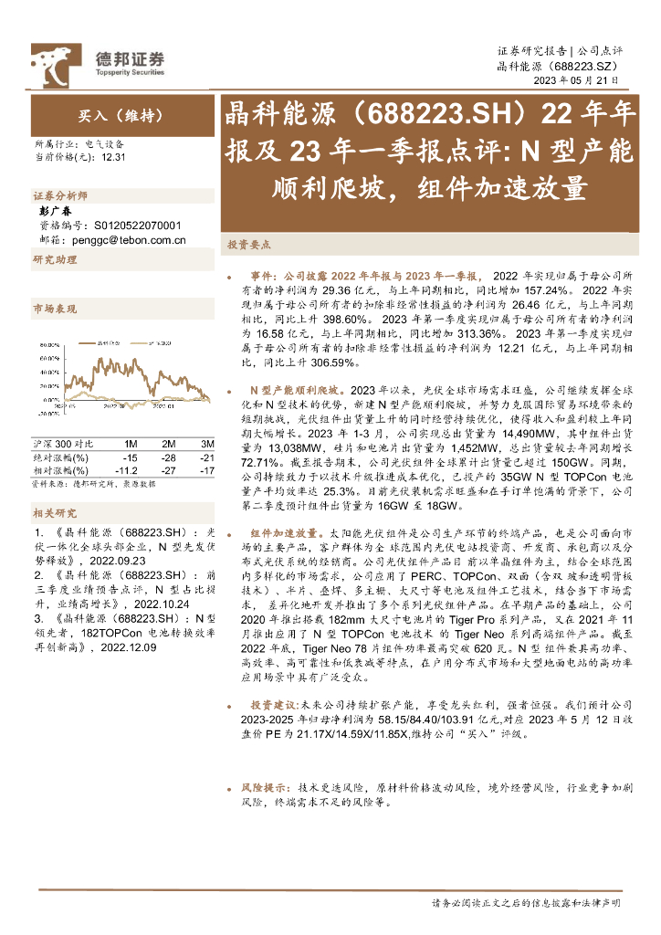 德邦证券:晶科能源(688223)-22年年报及23年一季报点评:N型产能顺利爬坡,组件加速放量.pdf
