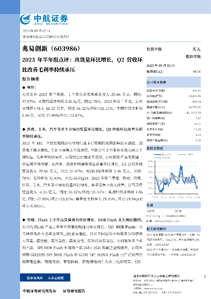 中航证券:兆易创新(603986)-2023年半年报点评:出货量环比增长,Q2营收环比改善毛利率持续承压.pdf