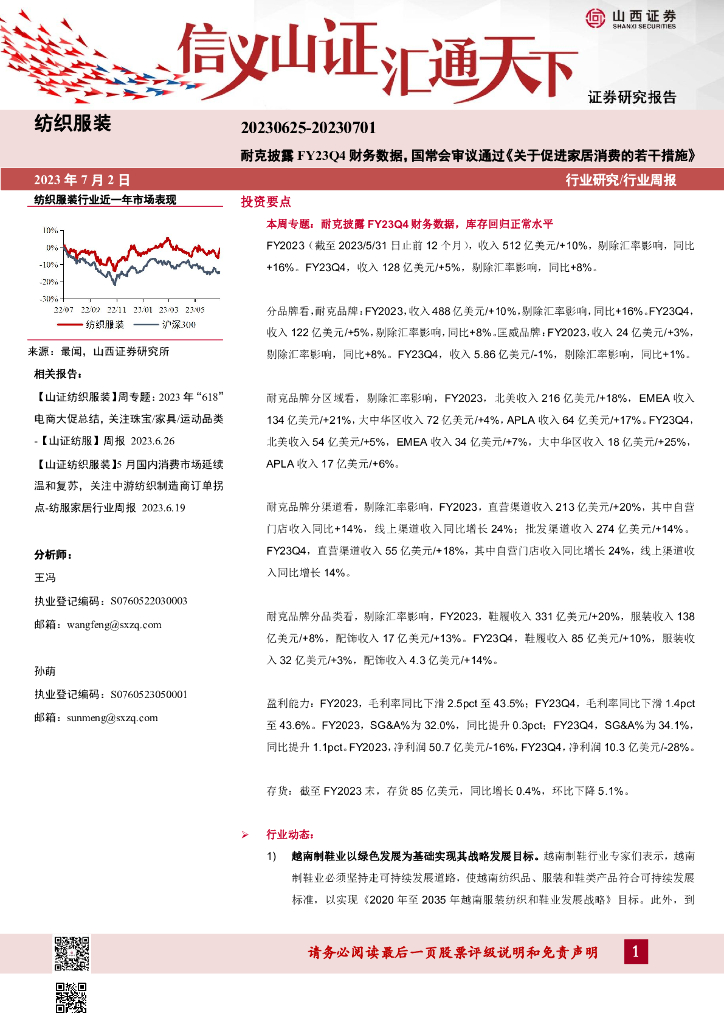 山西证券:纺织服装行业周报:耐克披露FY23Q4财务数据,国常会审议通过《关于促进家居消费的若干措施》.pdf