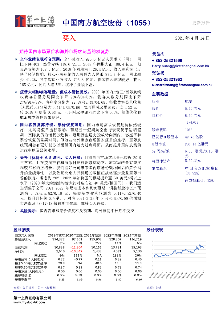 第一上海证券:中国南方航空股份(01055)港股公司研究报告-期待国内市场票价和海外市场客运量的双复苏.pdf