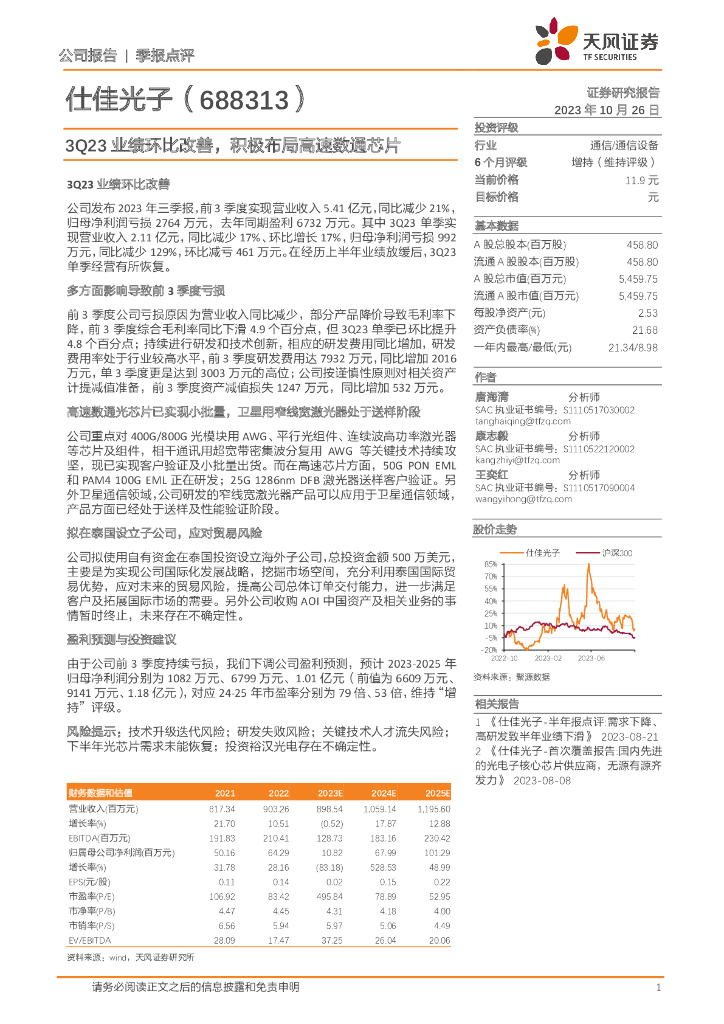 天风证券:仕佳光子(688313)-3Q23业绩环比改善,积极布局高速数通芯片.pdf