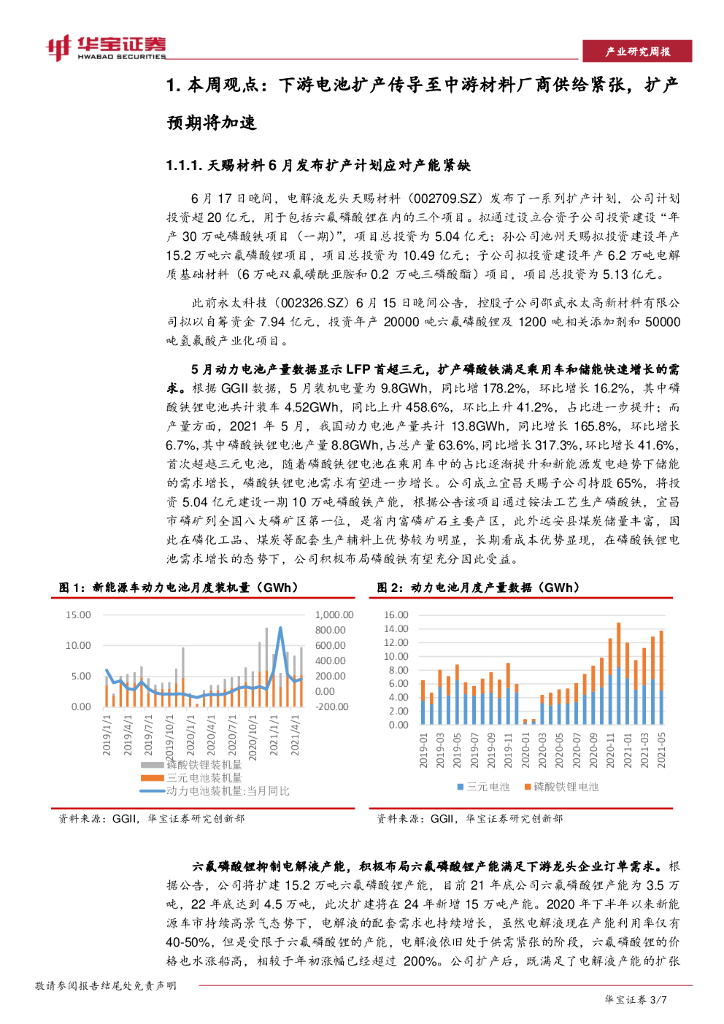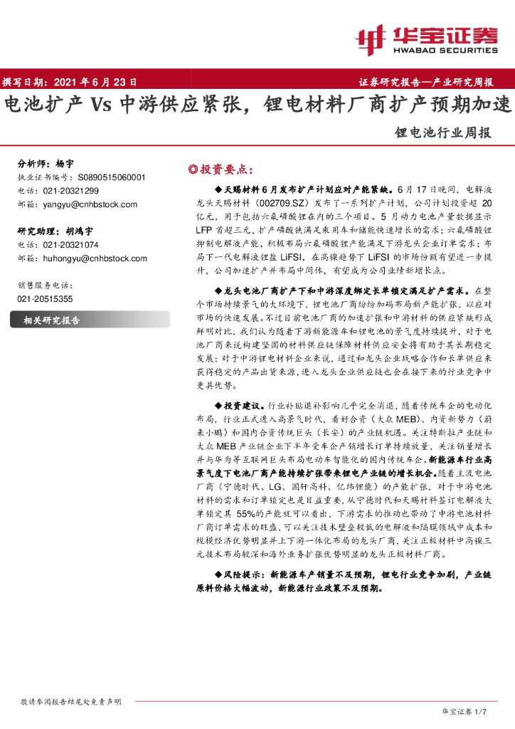 华宝证券:锂电池行业周报:电池扩产Vs中游供应紧张,锂电材料厂商扩产预期加速.pdf
