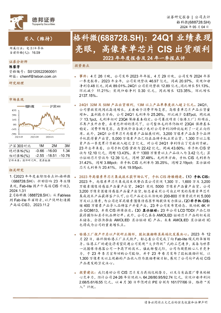 德邦证券:格科微(688728)-2023年年度报告及24年一季报点评:24Q1业绩表现亮眼,高像素单芯片CIS出货顺利.pdf