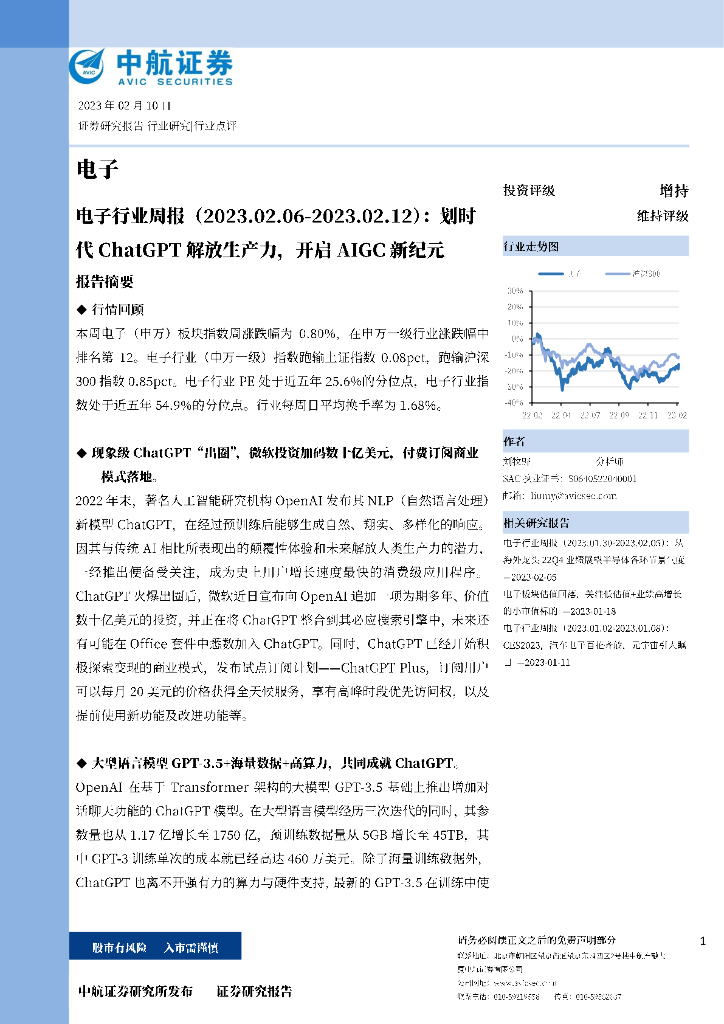中航证券:电子行业周报:划时代ChatGPT解放生产力,开启AIGC新纪元.pdf