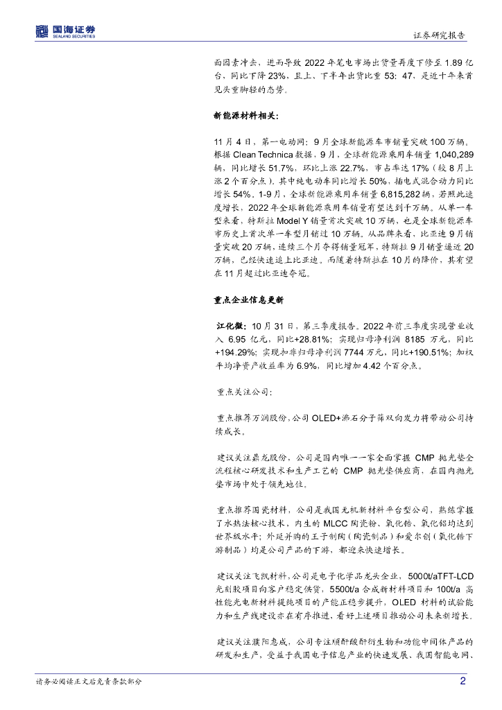 国海证券:化工新材料周报:9月全球新能源车市销量突破100万辆,江化微前三季度净利润同增194%.pdf