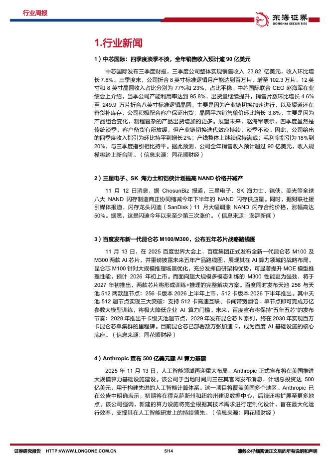 东海证券:电子行业周报:中芯国际三季度产能利用率与ASP双增,百度公布昆仑芯五年路线图.pdf