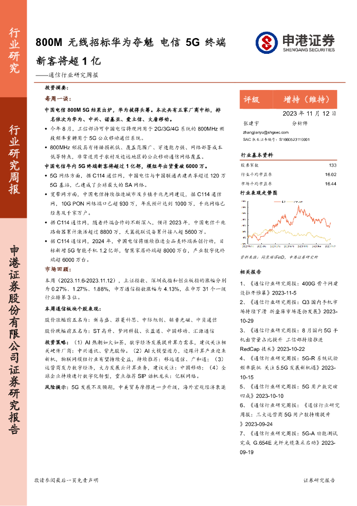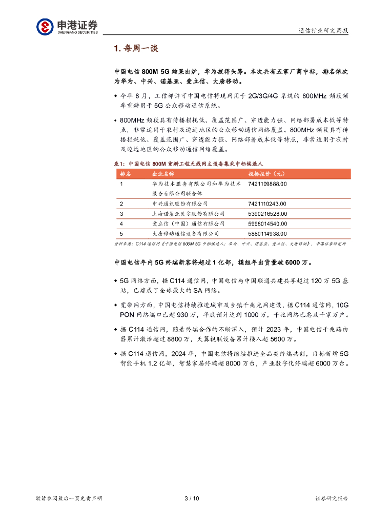 申港证券:通信行业研究周报:800M无线招标华为夺魁 电信5G终端新客将超1亿.pdf