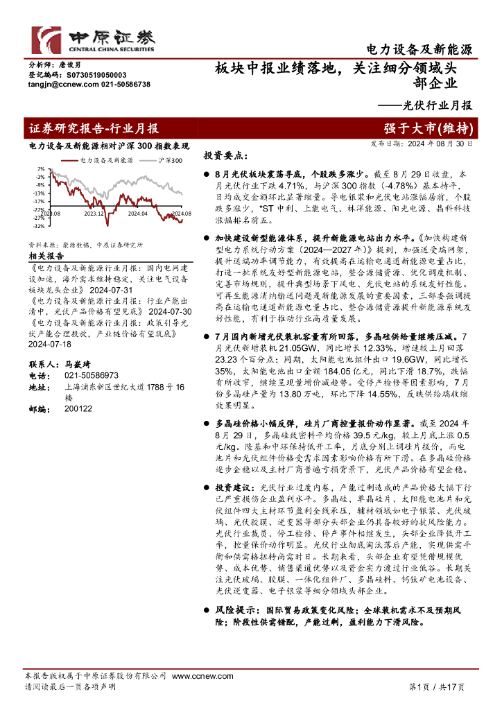 中原证券:光伏行业月报:板块中报业绩落地,关注细分领域头部企业.pdf