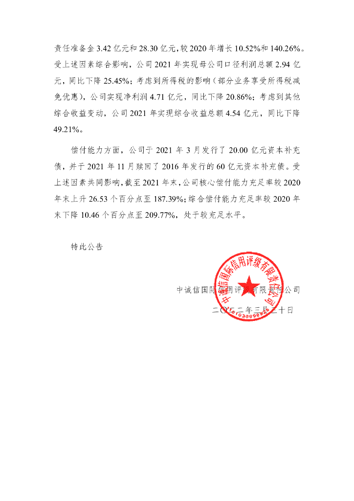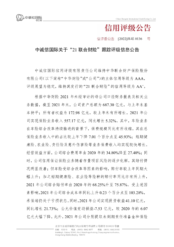 中诚信:中诚信国际关于”21联合财险“跟踪评级信息公告.pdf