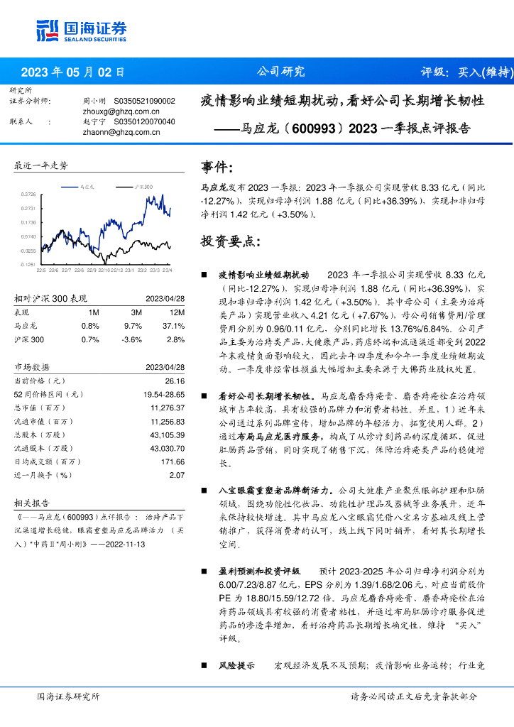 国海证券:马应龙(600993)-2023一季报点评报告:疫情影响业绩短期扰动,看好公司长期增长韧性.pdf