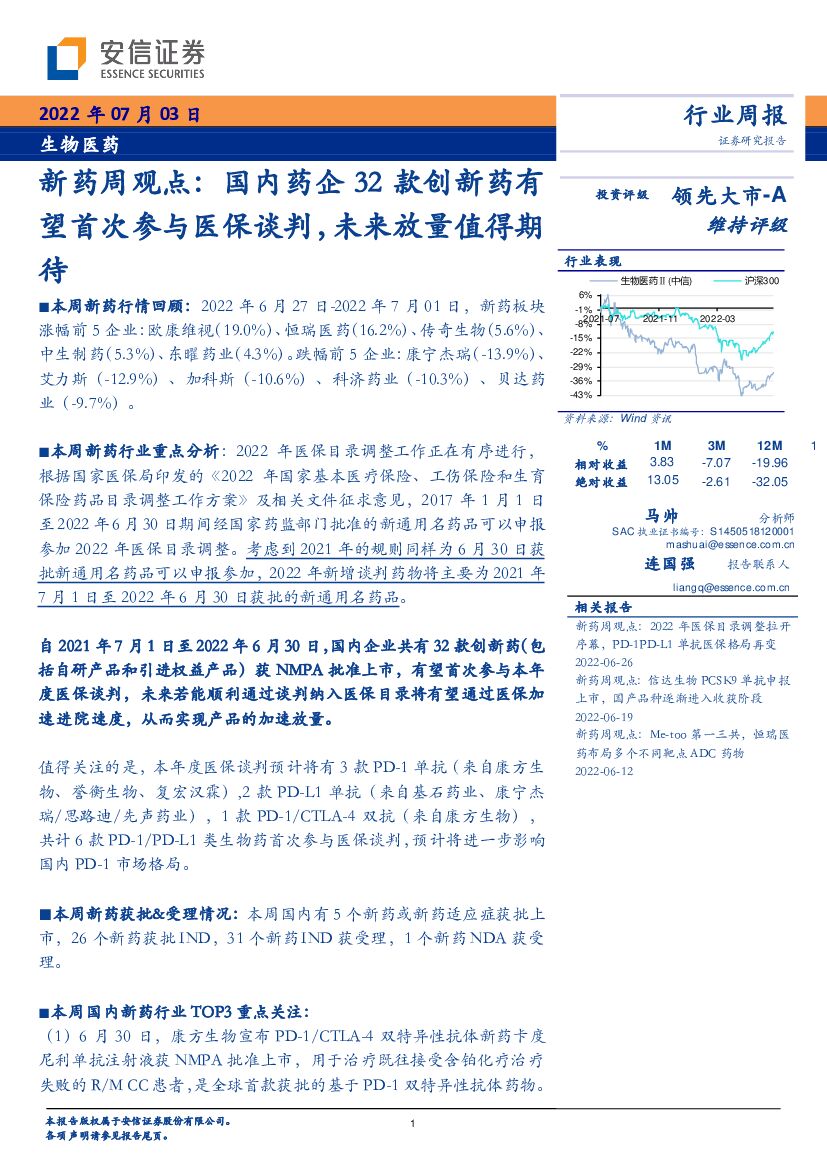 安信证券:生物医药:新药周观点:国内药企32款创新药有望首次参与医保谈判,未来放量值得期待.pdf