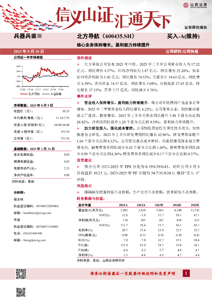 山西证券:北方导航(600435)-核心业务保持增长,盈利能力持续提升.pdf