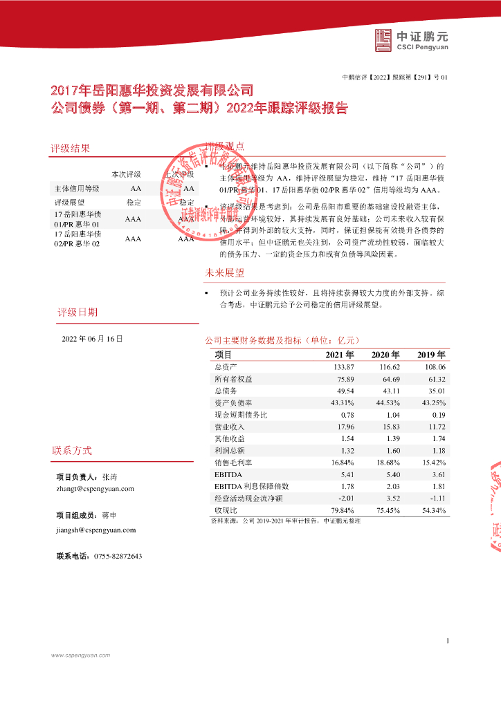 鹏元:2017年岳阳惠华投资发展有限公司公司债券(第一期、第二期)2022年跟踪评级报告.pdf