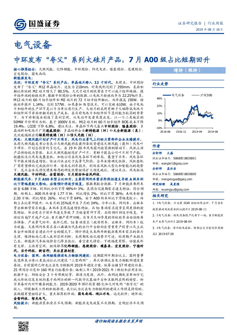 国盛证券:电气设备行业周报:中环发布“夸父”系列大硅片产品,7月A00级占比短期回升.pdf